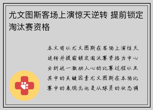 本文将以尤文图斯在客场上演惊天逆转并提前锁定淘汰赛资格为中心,分析这一激动人心的比赛过程以及其中的关键因素。尤文图斯在本场比赛中的表现,无论是从球员的状态调整,还是战术布置方面,均展示了球队强大的逆境...