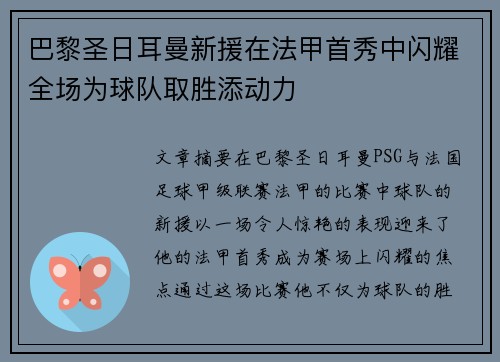 文章摘要:在巴黎圣日耳曼(PSG)与法国足球甲级联赛(法甲)的比赛中,球队的新援以一场令人惊艳的表现迎来了他的法甲首秀,成为赛场上闪耀的焦点。通过这场比赛,他不仅为球队的胜利贡献了重要力量,还在场上展...
