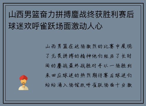 山西男篮在这场激烈的比赛中展现了无畏拼搏的精神,他们经历了长时间的鏖战,最终战胜对手,以一场胜利来回应球迷的热烈期待。赛后,球迷们纷纷涌入场馆,欢呼雀跃,场面十分激动人心。这场比赛不仅展示了山西男篮顽...