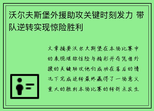 文章摘要:沃尔夫斯堡在本场比赛中的表现堪称惊险与精彩并存,凭借外援的关键助攻,他们成功在落后的情况下完成逆转,最终赢得了一场意义重大的胜利。本场比赛的转折点发生在关键时刻,外援球员凭借卓越的技术和对比...